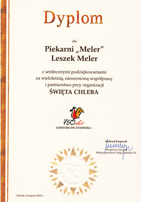 - Dyplom - wieloletnia współpraca przy organizacji Święta Chleba - 2010