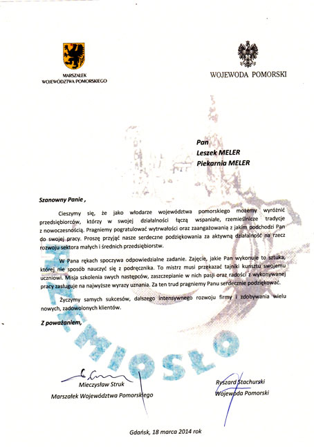 - Podziękowanie od Wojewody Pomorskiego - 2014