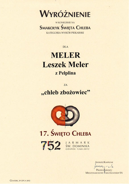 - Wyróżnienie - "Chleb zbożowiec"- Święto Chleba - 2012